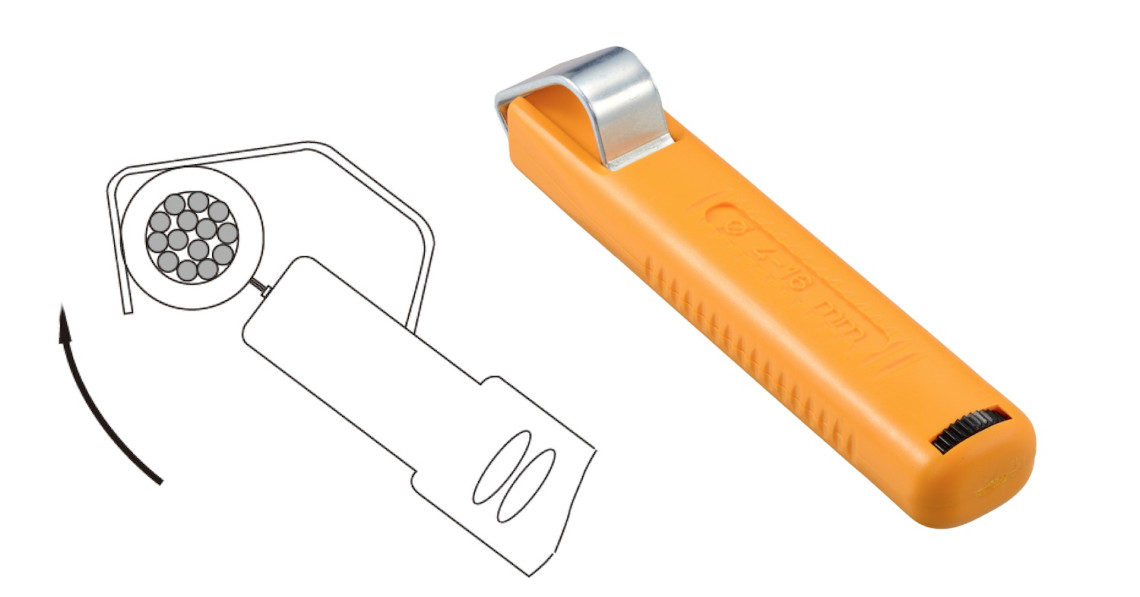Adjustable cutting depth to match the thickness of the cable jacket.